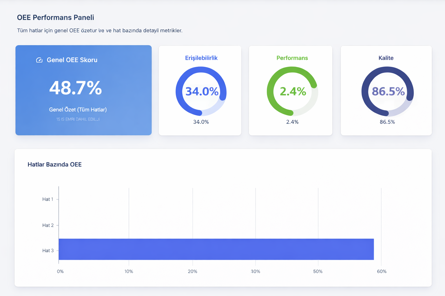 Tüm üretim hatlarında erişilebilirlik, performans ve kalite metriklerini anında takip edin. Canlı panolarla veri odaklı kararlar alın.